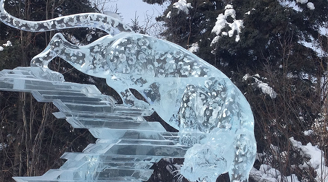 Pahatan seekor macan tutul yang sedang menuruni anak tangga. Karya ini begitu realistis sampai motif tutul pada kulitnya pun dibuat juga. Kalau dilihat pada malam hari, pasti nggak ada yang percaya kalau ini Cuma pahatan es!