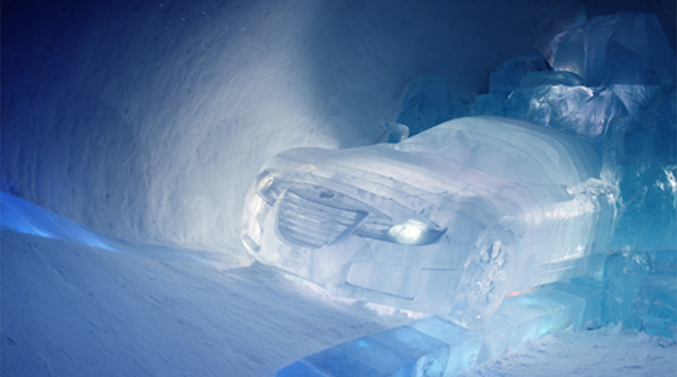 Karya yang satu ini kerennya kebangetan. Pahatan es berbentuk mobil mewah yang menerobos dinding es yang keras. Perhatikan juga efek lampu yang membuat mobil es ini semakin realistis dan mengagumkan!