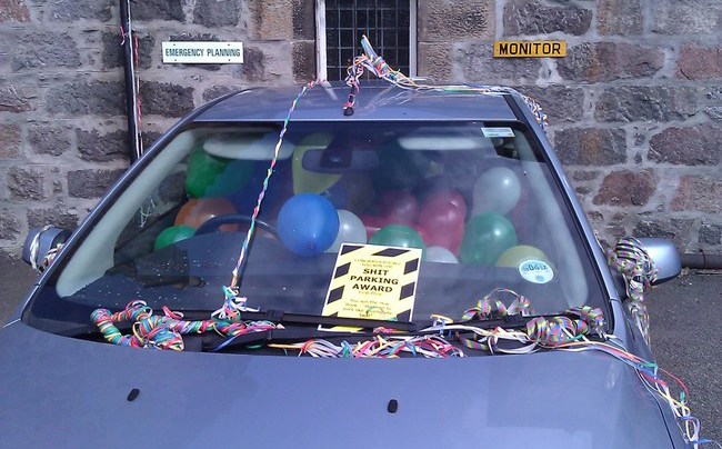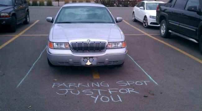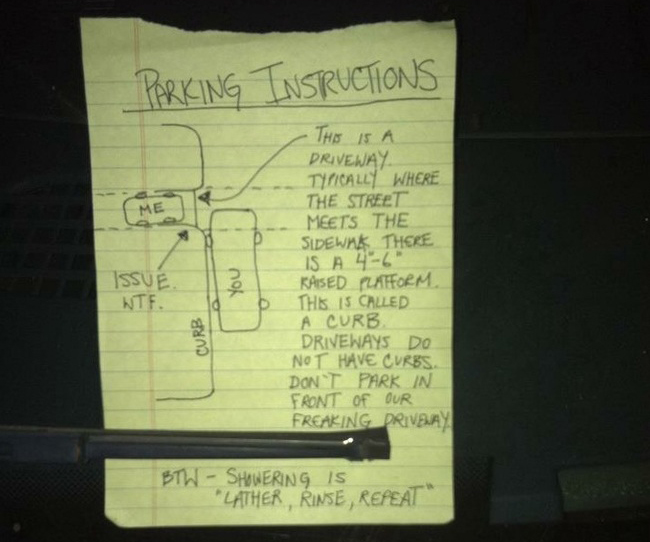 Mungkin tiap orang yang parkir sembarangan perlu selebaran petunjuk parkir seperti ini di kaca depan mobilnya. Nice idea!