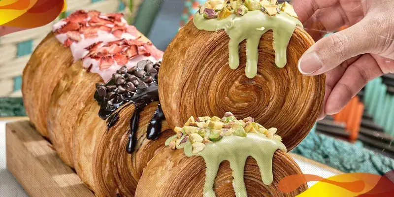 Cromboloni itu kayak croissant, tapi on steroids! Dia sendiri adalah kombinasi dari croissant dan bomboloni, jadi ya croissant yang isinya lumer kayak bomboloni. Bentuknya yang lebih gede, isiannya lumer, dan topping-nya banyak kayak cokelat, matcha, atau keju, Cromboloni sukses bikin antrian panjang di beberapa toko roti. Cobain deh, Bro, sensasi crunchy di luar tapi lembut di dalem. Dijamin nagih!