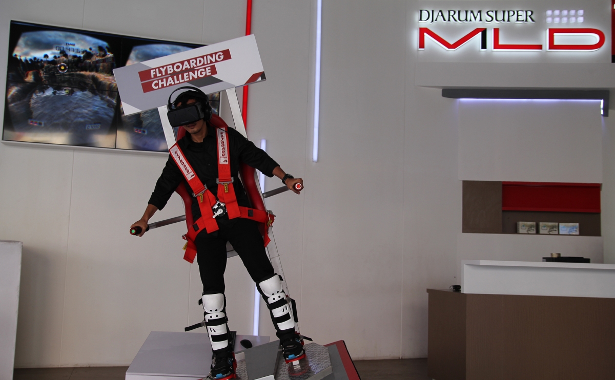 Flyboarding simulator adalah sebuah alat khusus yang didesain untuk mengobati rasa penasaran masyarakat Indonesia terhadap olahraga flyboarding. Alat ini terdiri dari motor penggerak di bagian kaki, sandaran kursi berpengaman dan sebuah virtual reality  (VR) googles untuk menghadirkan suasana ber-flyboarding yang nyata. Uniknya, VR google yang dipakai seperti kacamata ini juga bisa mengontrol gerakan mesin simulator, sehingga siapapun yang mencoba alat ini bisa bergerak-gerak layaknya pemain flyboarding profesional. Bedanya, di sini kita nggak usah takut jatuh dan kebasahan, karena flyboarding simulator ini didesain oleh para ahli dan 100% aman.