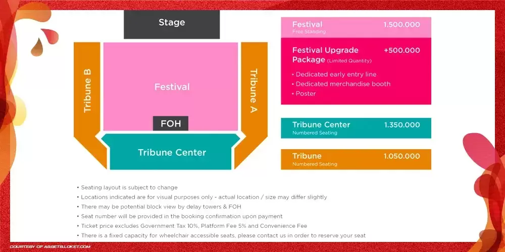 - Festival (area berdiri di depan panggung): Rp1.500.000;
