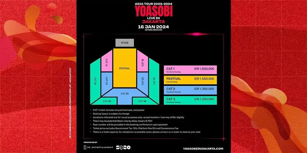 - Category 1 (seated area dekat panggung): Rp1,85 juta.